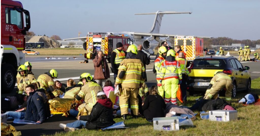 In der simulierten Situation war ein Flugzeug kurz vor dem Aufsetzen mit einem Schwarm Vögel zusammengestoßen. Der sogenannte Vogelschlag beschädigte ein Triebwerk so schwer, dass es bei der anschließenden Notlandung zu einem Feuer und einer Explosion kam. Auch diese wurde simuliert. Die Crew leitete daraufhin die Evakuierung ein.