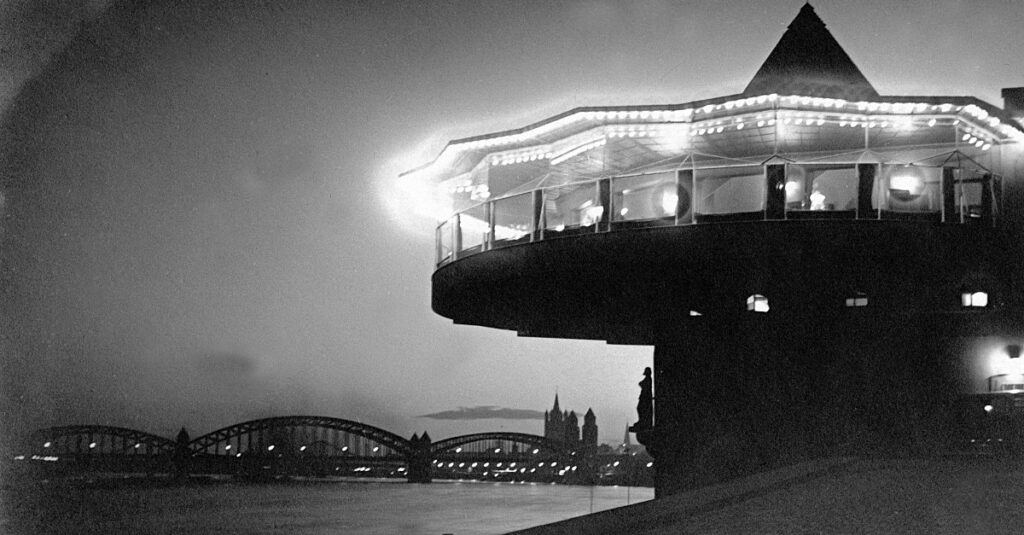 In den äußeren Ring um die Bastei passten einst zwei Tischreihen. Hier schwebte man quasi über der Rheinpromenade und blickte durch die großen Panoramafenster auf den Rhein, die Hohenzollernbrücke und den Dom. Die Bilder zeigen, wie die Bastei 1926 (innen) und 1929 (außen) ausgesehen hat.